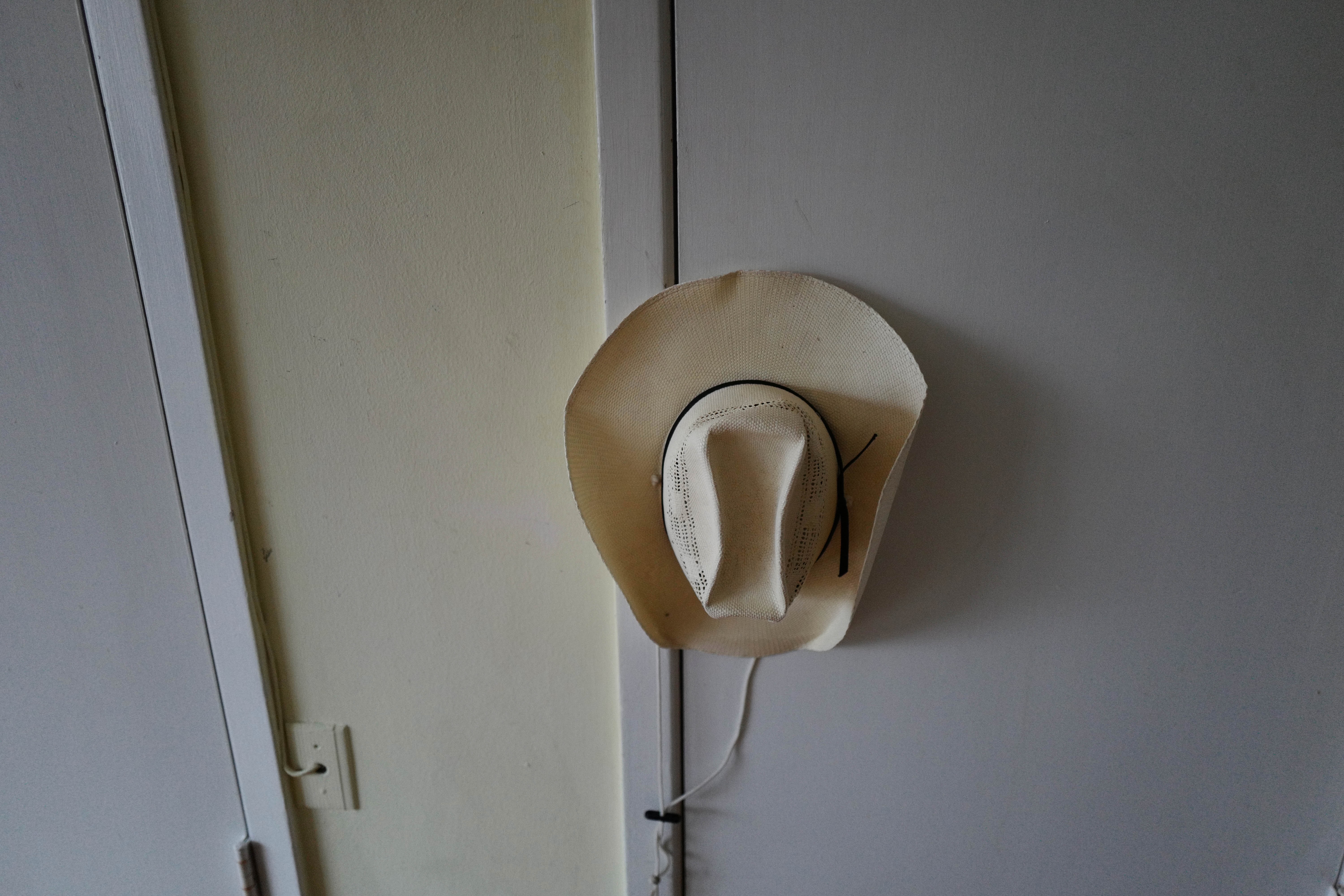 A solitary cowboy hat hangs against a muted wall, capturing a sense of nostalgia and simplicity. The soft, natural light gently illuminates the hat's texture and contours, emphasizing its shape and the shadows it casts. This composition evokes a quiet moment, hinting at stories of past adventures and a longing for the open outdoors.