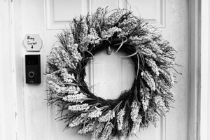 This monochromatic photograph highlights a beautifully crafted wreath adorned with delicate flowers, hung on a plain door. The contrasting tones emphasize the wreath's intricate details, creating a warm yet inviting atmosphere. A simple doorbell sign adds a touch of modernity, juxtaposing the natural elements of the wreath with contemporary convenience.