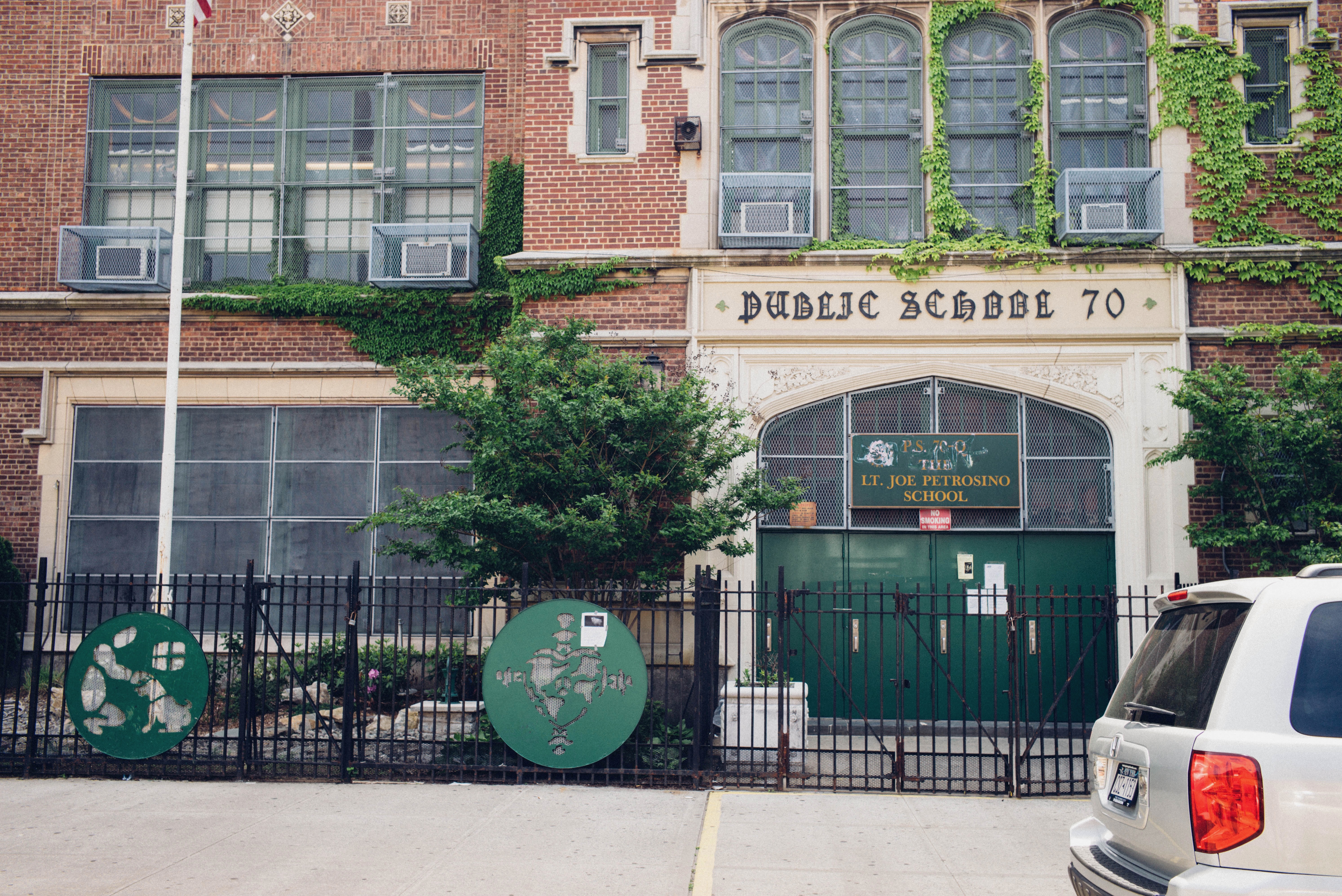 The photograph captures the historic facade of Public School 70, adorned with creeping ivy that breathes life into its vintage brick structure. Natural light filters through the broad windows, enhancing the welcoming yet nostalgic atmosphere of the school, while the surrounding greenery adds a touch of warmth and vibrancy. The overall composition juxtaposes the sturdy architecture against the gentle encroachment of nature, symbolizing a blend of tradition and growth.
