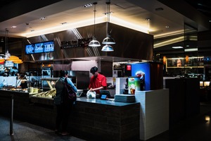 In this bustling kitchen scene, a customer engages with a staff member at a churrascaria, illuminated by warm overhead lights that contrast with the sleek metallic surfaces. The composition captures the intimacy of the moment, drawing attention to the exchange and the inviting ambiance of the restaurant. Shadows deepen the mood, suggesting a late-night charm where delicious aromas fill the air.
