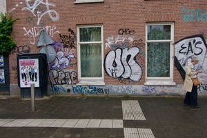 The photograph captures a gritty urban scene dominated by a graffiti-covered brick wall. A lone figure in a light coat strolls past, engrossed in their phone, contrasting the vibrancy of street art with a sense of solitude. The cloudy skies and muted colors lend a reflective mood to the composition, highlighting the juxtaposition of urban life and personal moments.