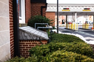 The photograph captures a quiet corner of an urban environment, featuring a low angle view of neatly manicured bushes framing a brick building. Soft, natural light gently illuminates the scene, enhancing the muted colors and highlighting the textures of the materials. The mood is calm and contemplative, evoking a sense of stillness amidst the hustle and bustle of city life.