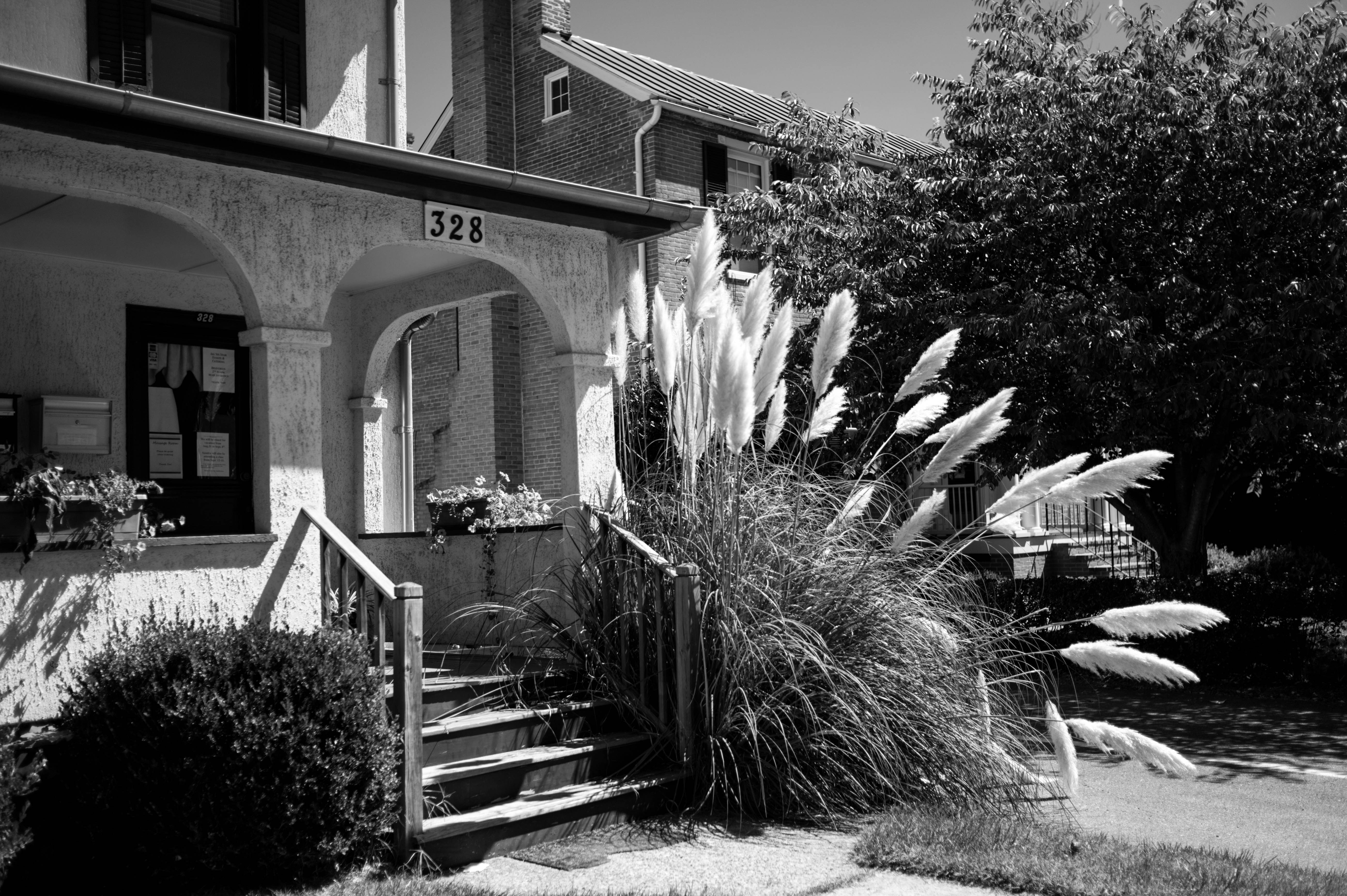 This black and white photograph captures the serene front porch of a house, marked by the number 328. Tall pampas grass frames the entrance, creating a soft, natural contrast against the structured lines of the home, while the warm sunlight casts gentle shadows, enhancing a tranquil and inviting mood.