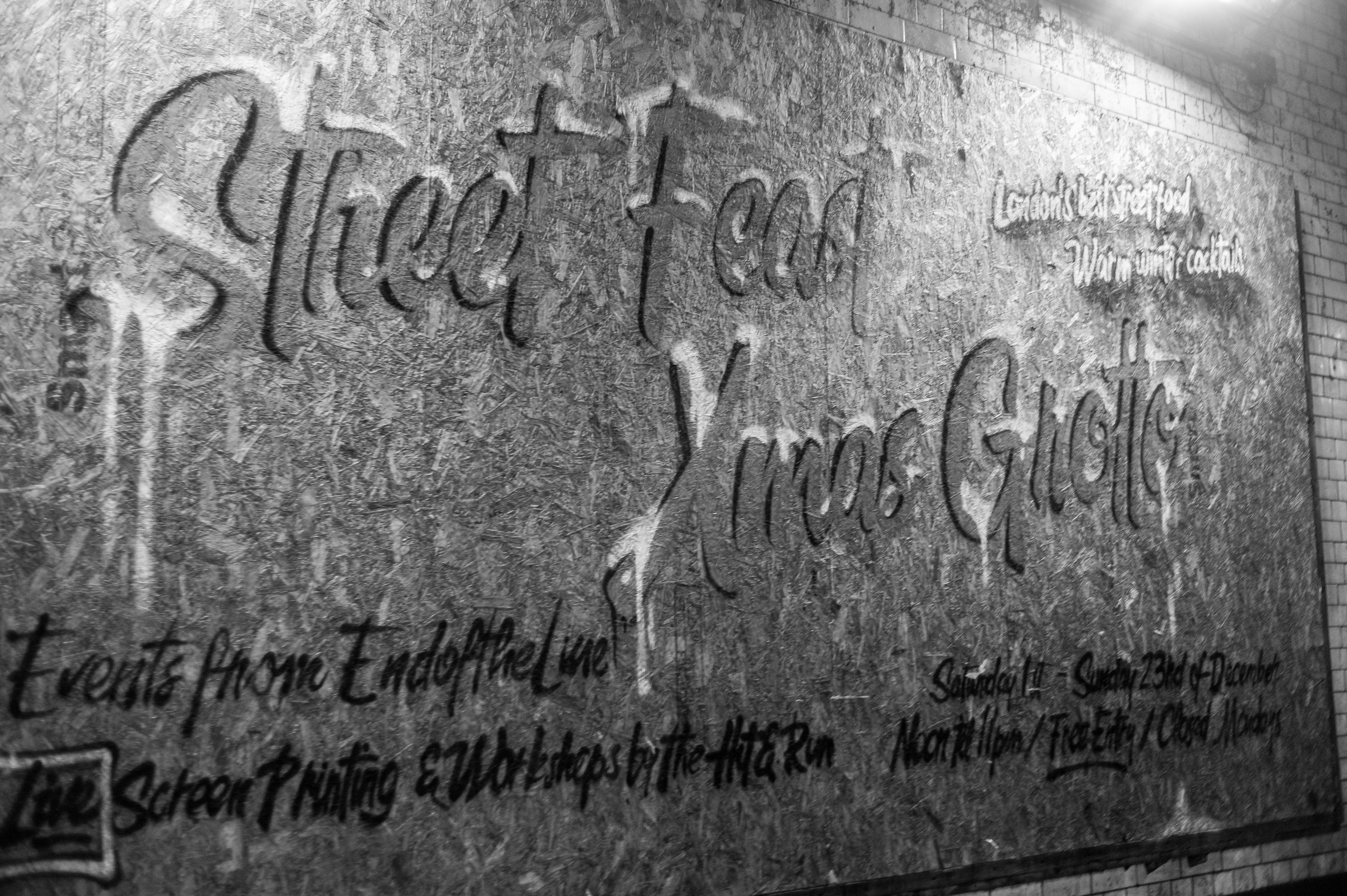 This black and white photograph captures a textured wooden wall covered in handwritten text advertising a local street food event. The stark lighting casts subtle shadows, enhancing the raw, urban feel of the environment, while the artistic lettering invites intrigue and curiosity.