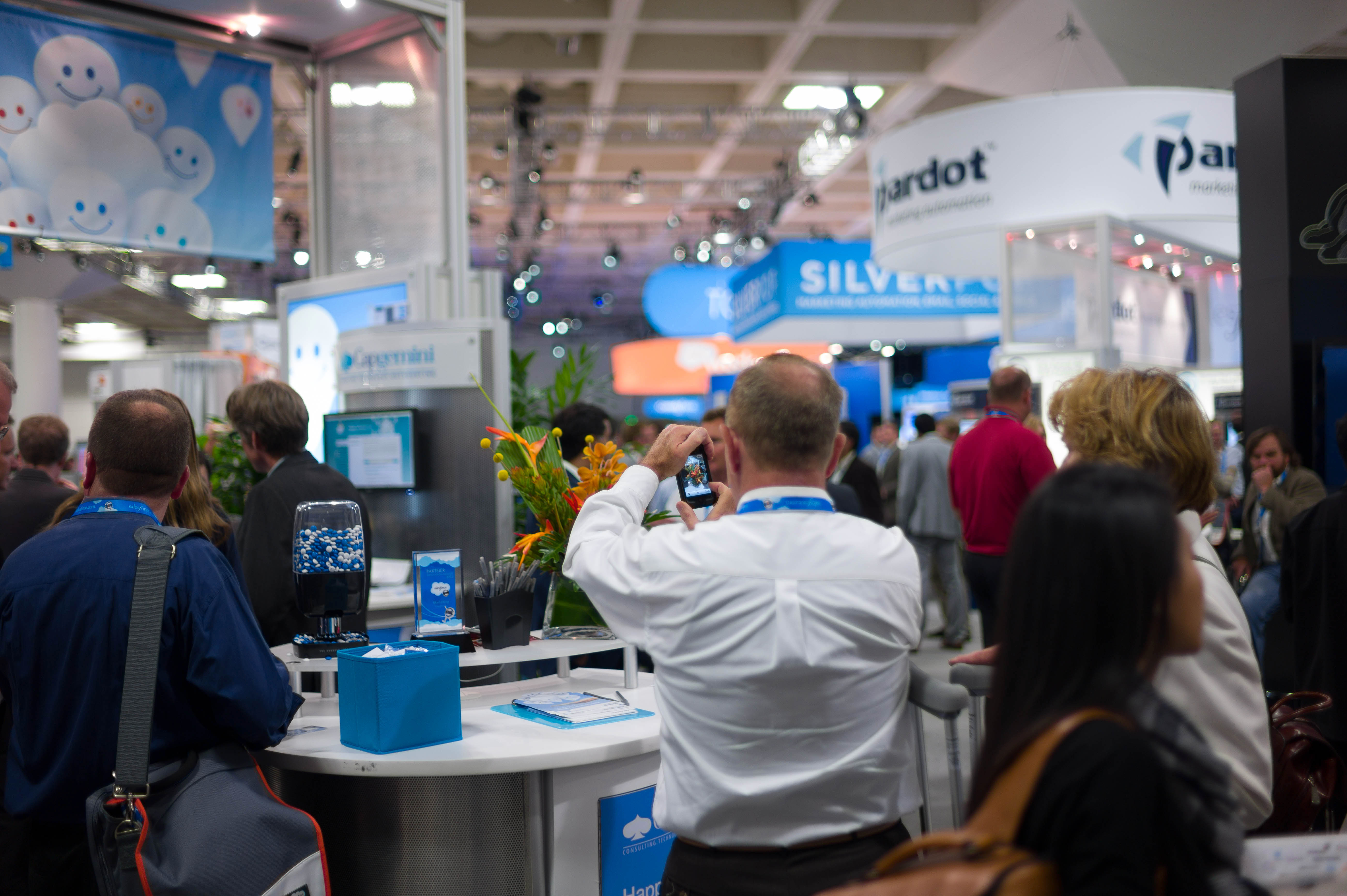 The photograph captures a bustling conference setting, filled with attendees immersed in conversations and taking photos. The bright lighting and vibrant blue displays create an energetic mood, while the arrangement of people around an information booth adds to the sense of movement and engagement within the event.