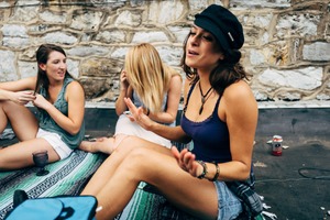 The photograph captures a lively outdoor gathering among friends, seated on a textured blanket that adds a cozy touch. The subjects are immersed in conversation and laughter, with warm, diffused natural light enhancing the relaxed and joyful atmosphere. The composition focuses on one woman animatedly speaking, while her friends engage playfully, creating a sense of unity and lightheartedness.