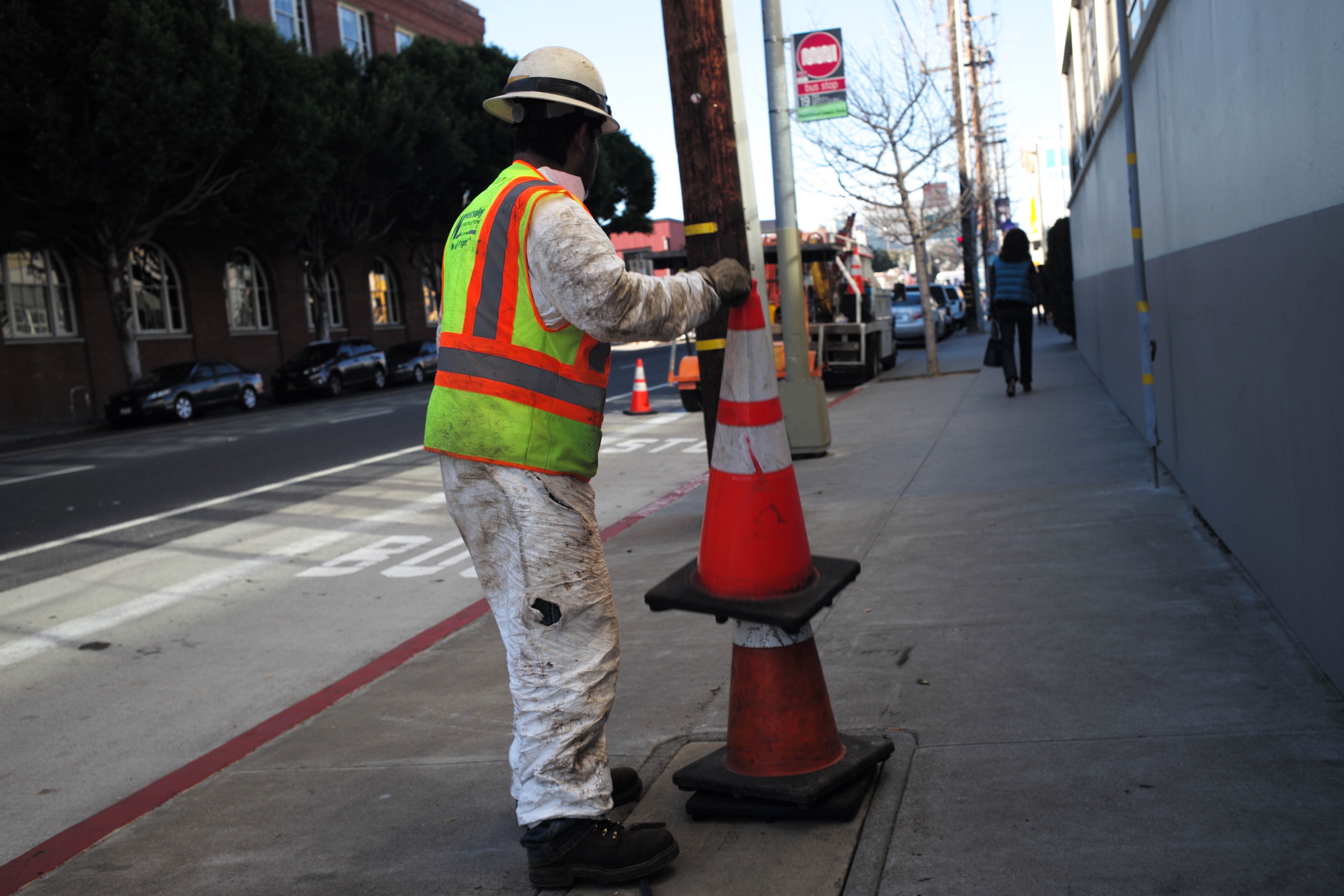 A solitary worker in a vibrant safety vest carefully adjusts a traffic cone on a bustling city sidewalk, embodying the everyday diligence of urban life. The stark contrast of his bright uniform against the muted backdrop of the streets creates a sense of urgency and focus. Soft, natural light casts gentle shadows, highlighting the textures of his worn clothing and the concrete surroundings, reinforcing a mood of industriousness in a busy metropolis.