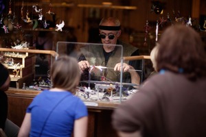 The photograph captures a skilled artisan engrossed in the delicate art of glass crafting, surrounded by an array of whimsical figurines. Soft, natural light illuminates the scene, highlighting the focused expression of the craftsman while casting gentle shadows on the onlookers, whose curious faces peak from the foreground. The composition draws the eye to the intricate details of the glasswork, creating a sense of wonder and engagement within a lively market atmosphere.