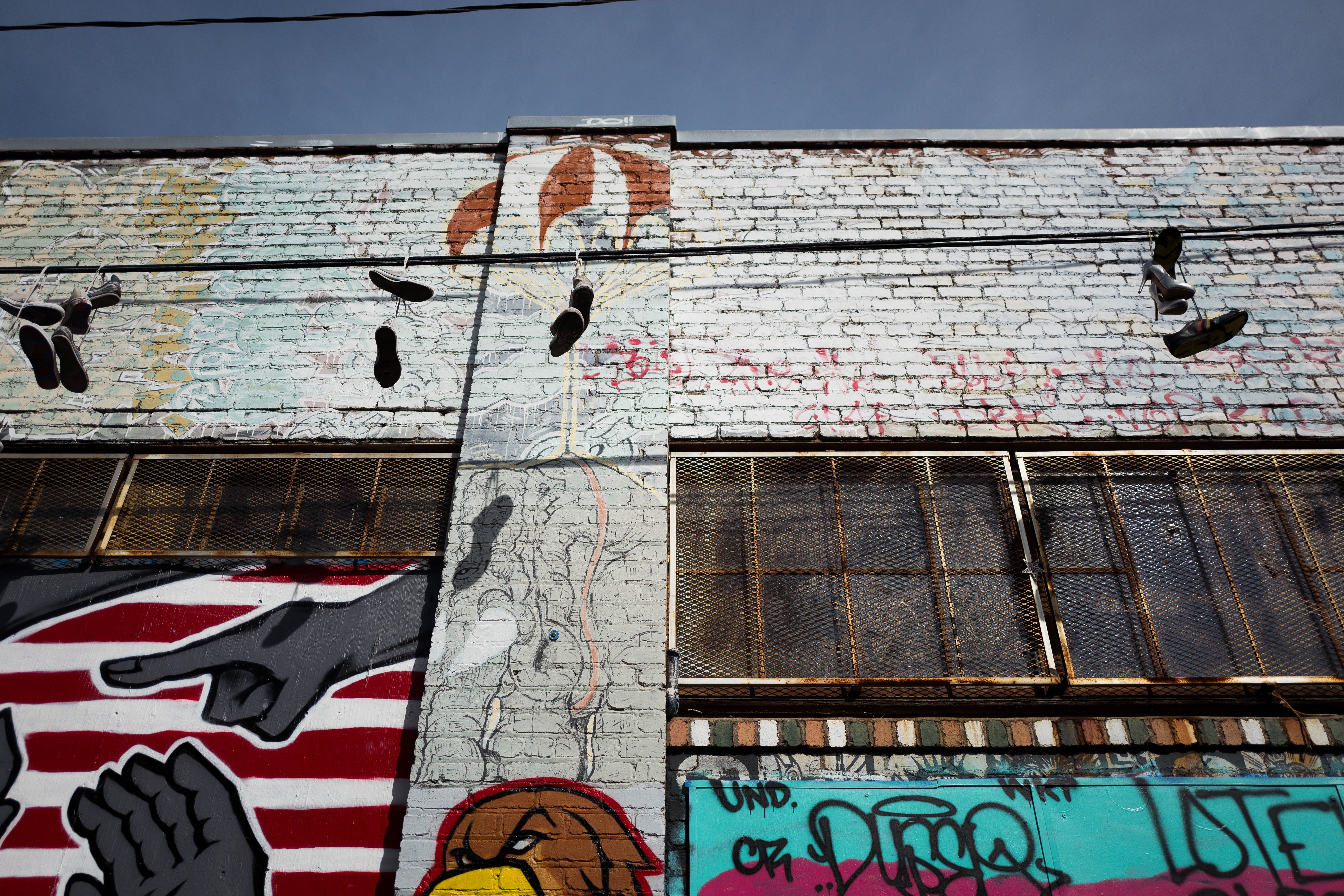 This photograph captures a vibrant graffiti-covered wall, adorned with an assortment of shoes dangling from wires, creating a sense of urban storytelling. The stark contrast between the colorful artwork and the textured brick highlights the raw beauty of street culture, while the overcast sky adds a moody ambiance. The composition draws the viewer's eye upward, inviting them to explore the layers of expression embedded in the space.