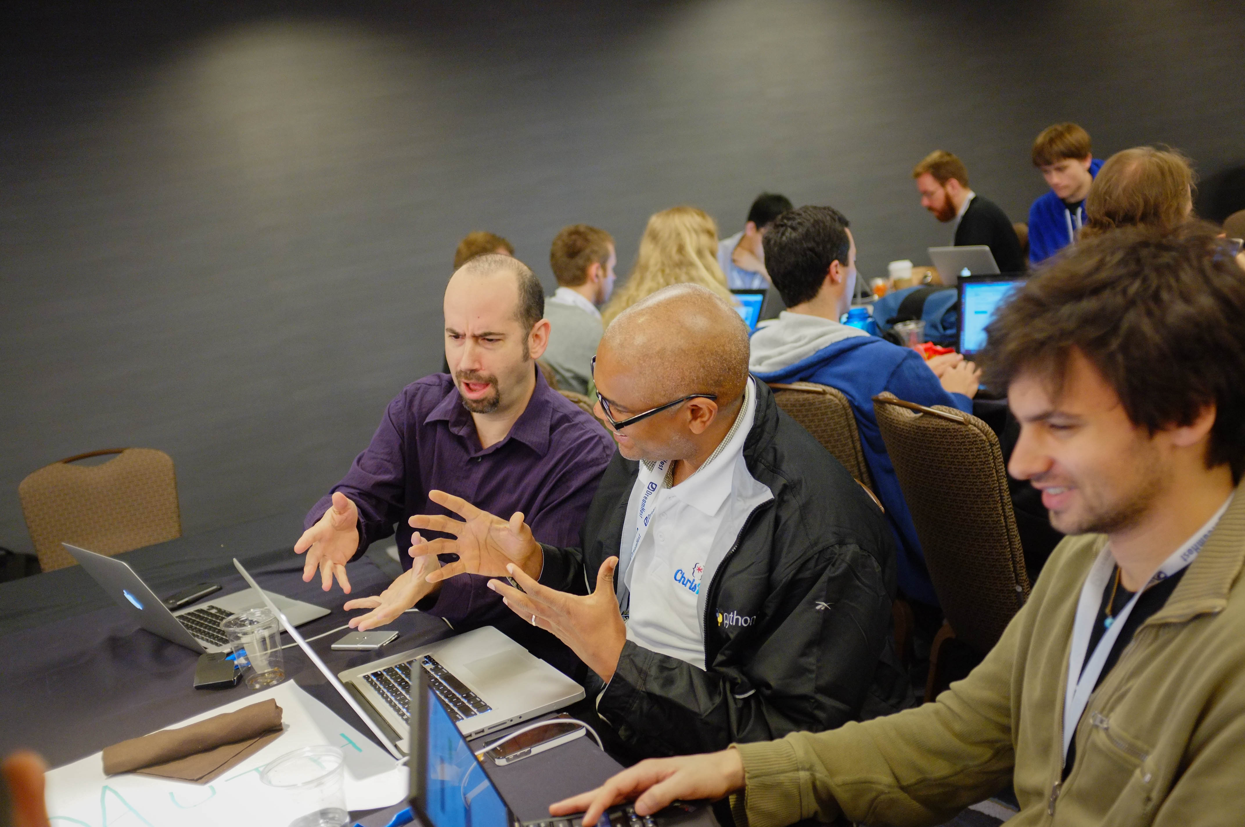 In a bustling workspace, a group of individuals is deeply engaged in a spirited discussion. The contrasting expressions of urgency and concentration among the participants, paired with soft ambient lighting, create a dynamic atmosphere of collaboration and creativity.
