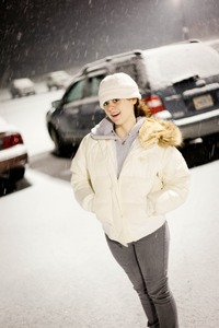 A young woman stands in a snow-covered parking lot, her warm winter jacket contrasting with the chilly atmosphere. The softly falling snowflakes create an enchanting backdrop, while the ambient lighting adds a whimsical glow to the scene, highlighting her playful expression. The composition balances her figure against the blurred silhouettes of parked cars, evoking a sense of solitude and peacefulness amidst the winter night.