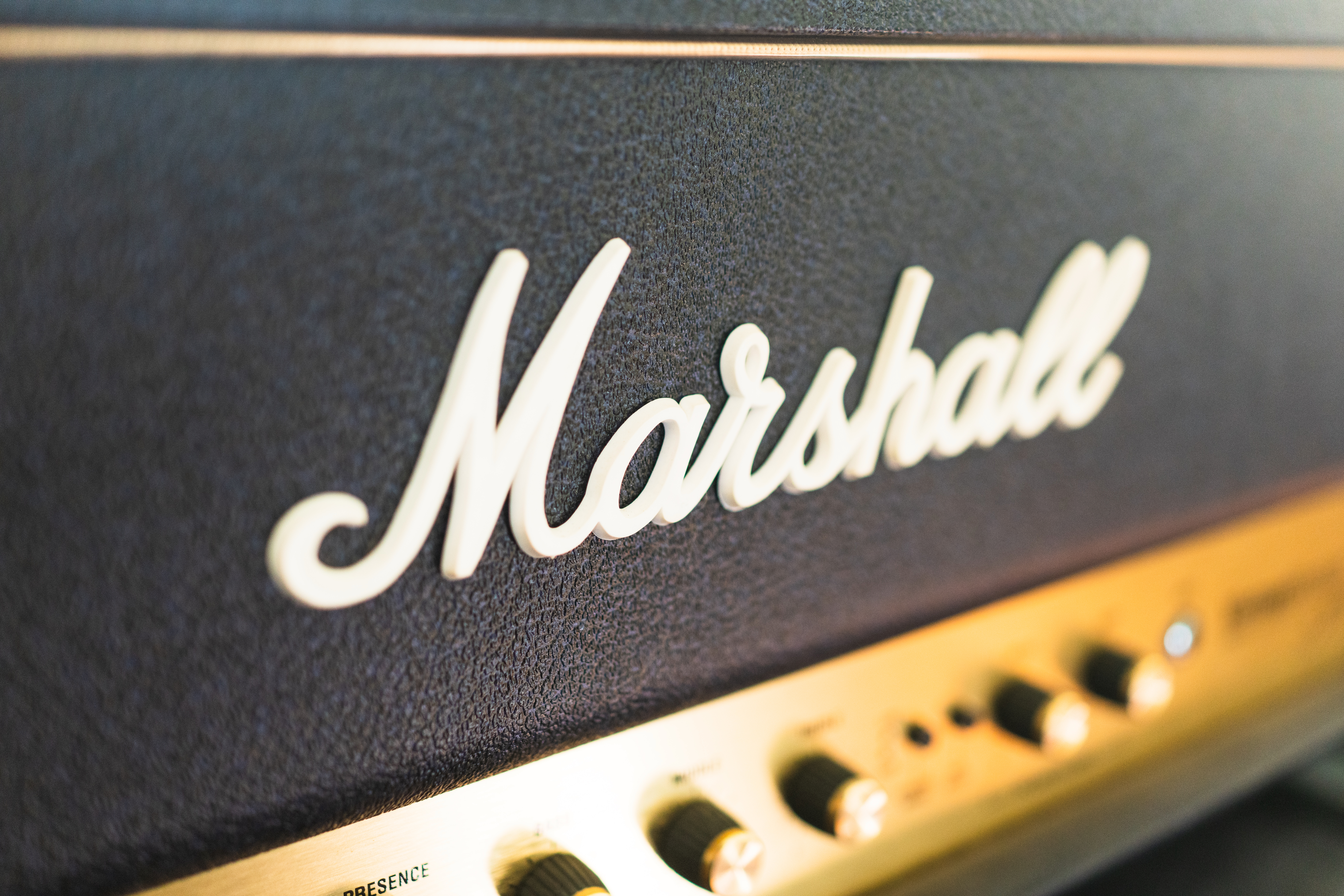 This close-up photograph of a Marshall amplifier captures the essence of music culture, characterized by its sleek design and rich textures. The warm, glowing light enhances the vintage appeal, creating an inviting atmosphere that resonates with the spirit of rock 'n' roll. The focus on the iconic logo emphasizes its significance in the world of sound, evoking nostalgia and a sense of creativity.