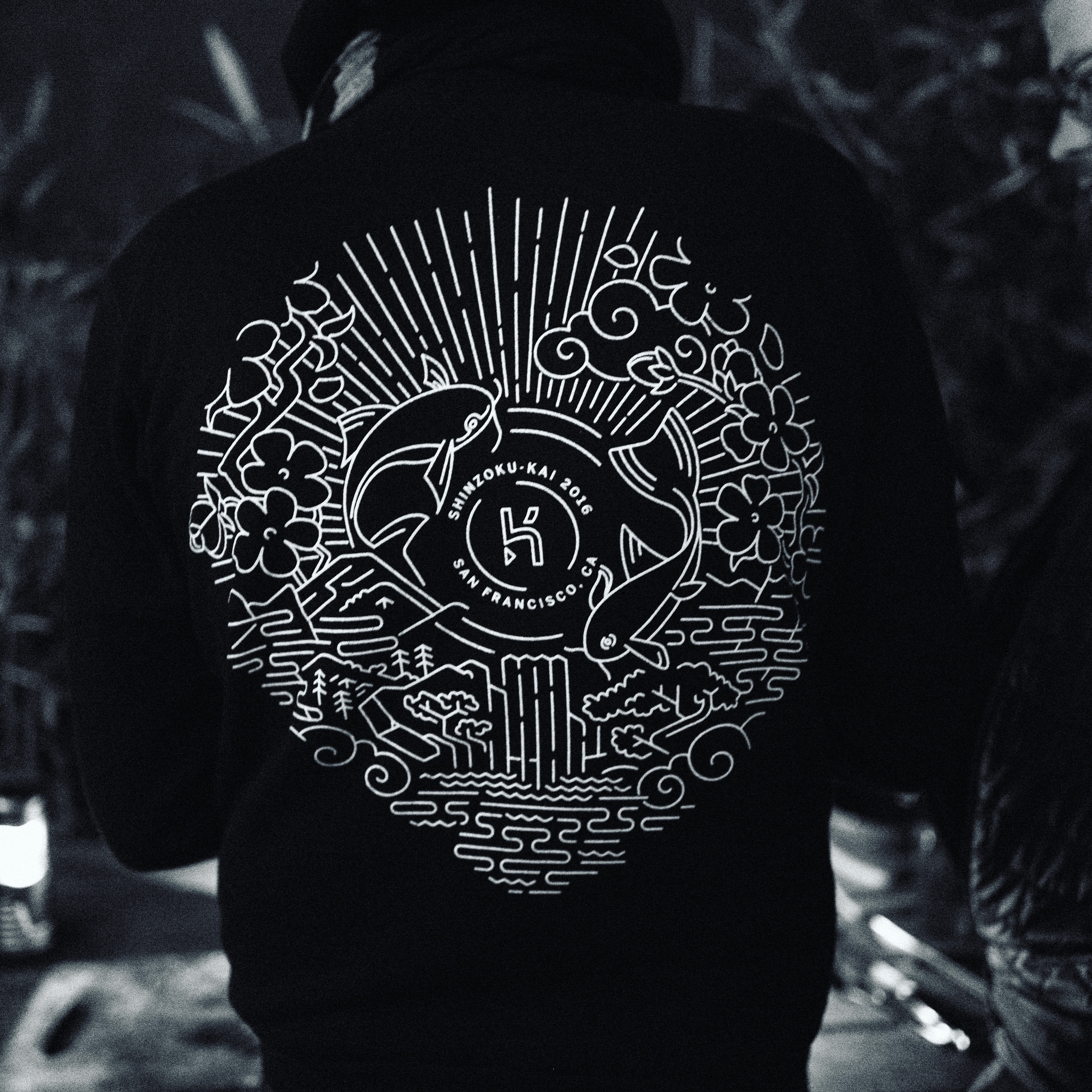The photograph centers on the back of a black hoodie adorned with a striking white graphic, showcasing intricate patterns inspired by nature, including waves and flowers. The contrasting colors create a moody atmosphere, enhanced by soft ambient lighting that highlights the artistry of the design. The composition invites contemplation, evoking a sense of connection to cultural aesthetics and the beauty of the natural world.