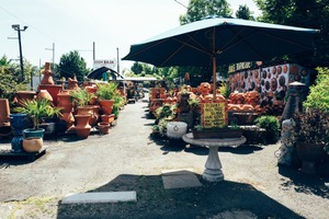 A vibrant garden shop brimming with terracotta pots and lush greenery invites exploration. Bright sunlight casts playful shadows, highlighting the whimsical sculptures amidst a serene atmosphere. The inviting sign encourages curiosity and interaction, creating a welcoming mood for passersby.