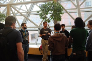 In this vibrant photograph, a diverse group of individuals attentively gathers around a speaker, engaged in animated discussion beneath the geometric glass structure of the venue. The interplay of natural light enhances the atmosphere, casting soft shadows and creating a warm, inviting mood. Lush greenery adds a touch of life to the setting, symbolizing growth and knowledge-sharing among the participants.
