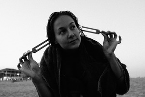 In this monochrome portrait, a young woman wrapped in a towel looks contemplatively towards the horizon, holding a tuning fork delicately between her fingers. The moody lighting and soft focus create a reflective atmosphere, enhancing the sense of introspection as she engages with the sounds of the ocean. The simplicity of the composition, framed by the beach backdrop, draws the viewer's attention to her expression and the unique object she holds.