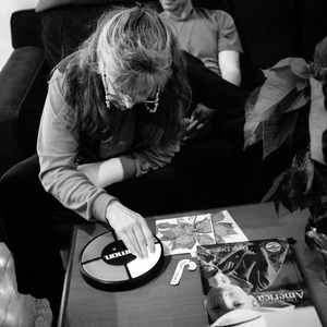 In a cozy indoor setting, a woman leans over a table, her focused expression illuminated by soft, natural light that casts gentle shadows. The monochrome tones emphasize the intimacy of the moment, as she interacts with a circular object, surrounded by magazines and decorative items that hint at a shared space. A figure looms in the background, adding depth to the scene and suggesting a sense of community and warmth.