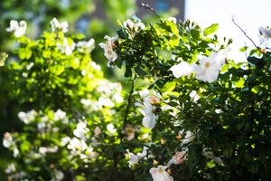 This photograph captures vibrant white flowers nestled among lush green leaves, creating a serene and inviting composition. Bathed in soft, dappled sunlight, the scene evokes a sense of tranquility and renewal, with the natural elements harmonizing beautifully. The blurred background adds depth, drawing the viewer’s eye towards the delicate blooms that seem to dance in the gentle breeze.