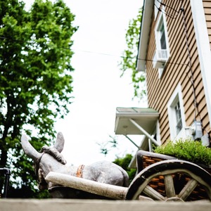 The photograph captures a weathered donkey sculpture pulling a cart, nestled against a backdrop of vibrant greenery and a charming wooden house. Soft, diffused lighting enhances the tranquil mood, evoking nostalgia and a sense of simplicity. The composition draws the eye toward the donkey, anchoring the scene with rustic allure amidst the lush surroundings.