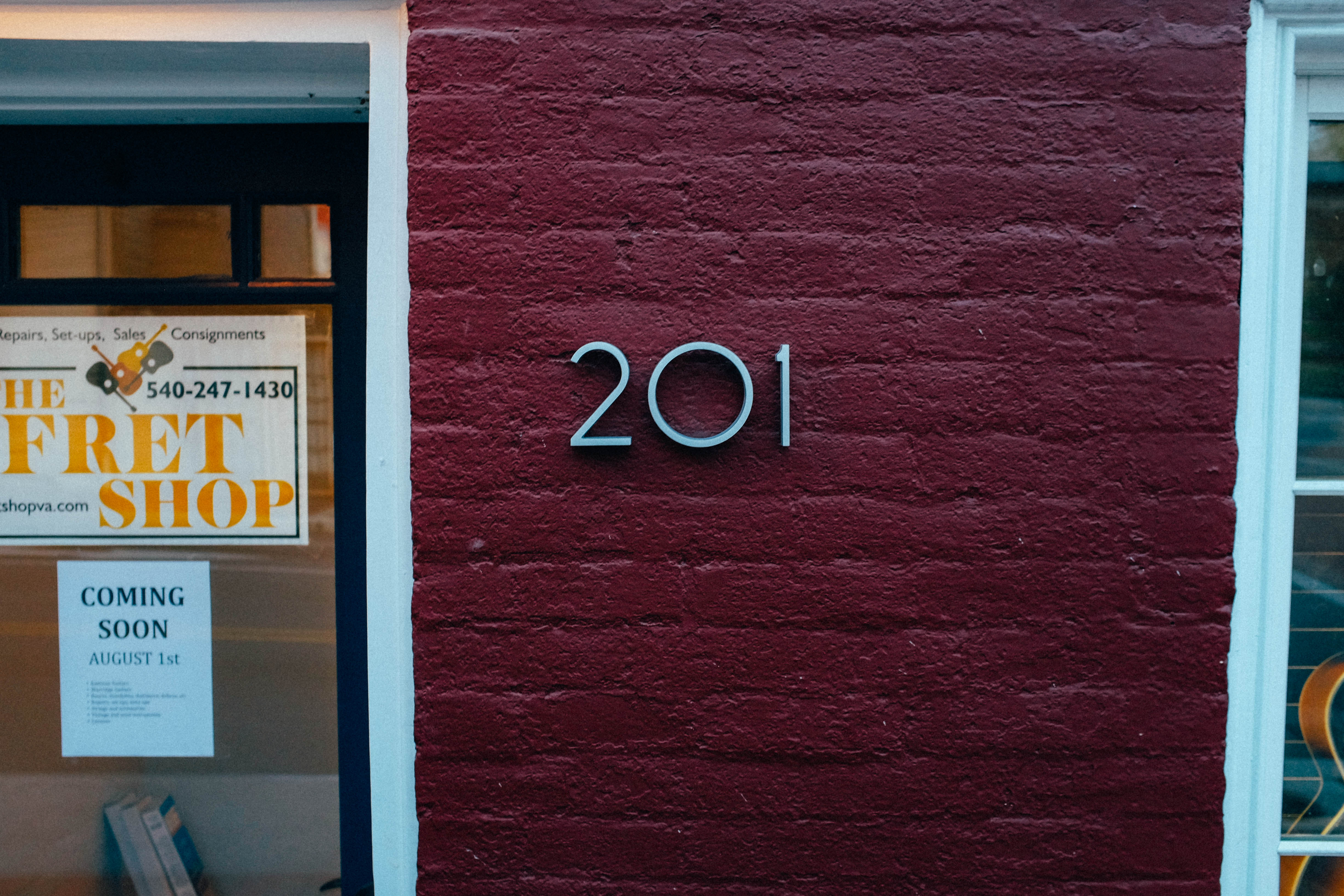 A vibrant crimson wall frames the entrance to The Fret Shop, with a modern numeral 201 inviting attention. The soft glow of the evening light creates a welcoming atmosphere, while a sign hints at an upcoming opening that stirs curiosity and anticipation. The composition draws the eye to both the shop's identity and the promise of new beginnings.