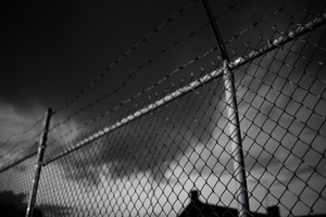 The photograph captures a close-up of a barbed wire fence, stark against a moody, cloud-filled sky. The monochrome palette enhances the sense of confinement and tension, while the blurred foreground creates an intimate connection to the fence's sharp edges. This composition evokes feelings of isolation and barriers, inviting viewers to ponder what lies beyond.