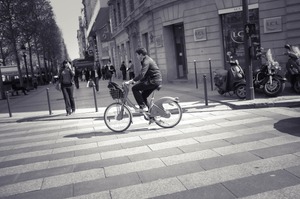 A lone cyclist rides through a pedestrian crosswalk, capturing a moment of city life. The sun-drenched street is filled with muted tones and soft shadows, creating an atmosphere that feels both calm and bustling. Surrounding figures add context to the everyday rhythm, highlighting the casual interplay of movement and stillness in an urban setting.