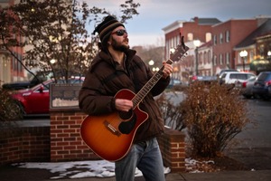 A young man clad in a warm jacket and beanie passionately strums his acoustic guitar, embodying a sense of freedom and creativity on a chilly evening. The soft, fading light of dusk casts a warm glow on his figure, enhancing the inviting atmosphere of the scene. Surrounding him, the muted colors of the urban backdrop blend harmoniously, adding to the intimate mood of a spontaneous street performance.