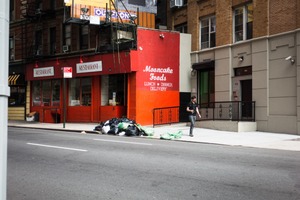 In an urban scene, a lone figure walks past a vibrant red restaurant facade, emphasizing a sense of isolation amidst city life. The contrasting elements of the fresh food establishment and the discarded trash on the sidewalk create a poignant commentary on the complexities of city living. Soft natural light bathes the street, enhancing the vivid colors and highlighting the stark juxtaposition of beauty and neglect.