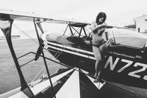 A striking monochrome image featuring a woman in minimal attire, poised confidently on the wing of a biplane, her body accentuated by the contrasting lines of the aircraft. The cloudy sky and muted colors enhance the mood of bold independence, while her posture conveys both vulnerability and strength. The composition draws the eye toward the intricate details of the plane and the subject’s fierce gaze, blending elements of aviation and human form.