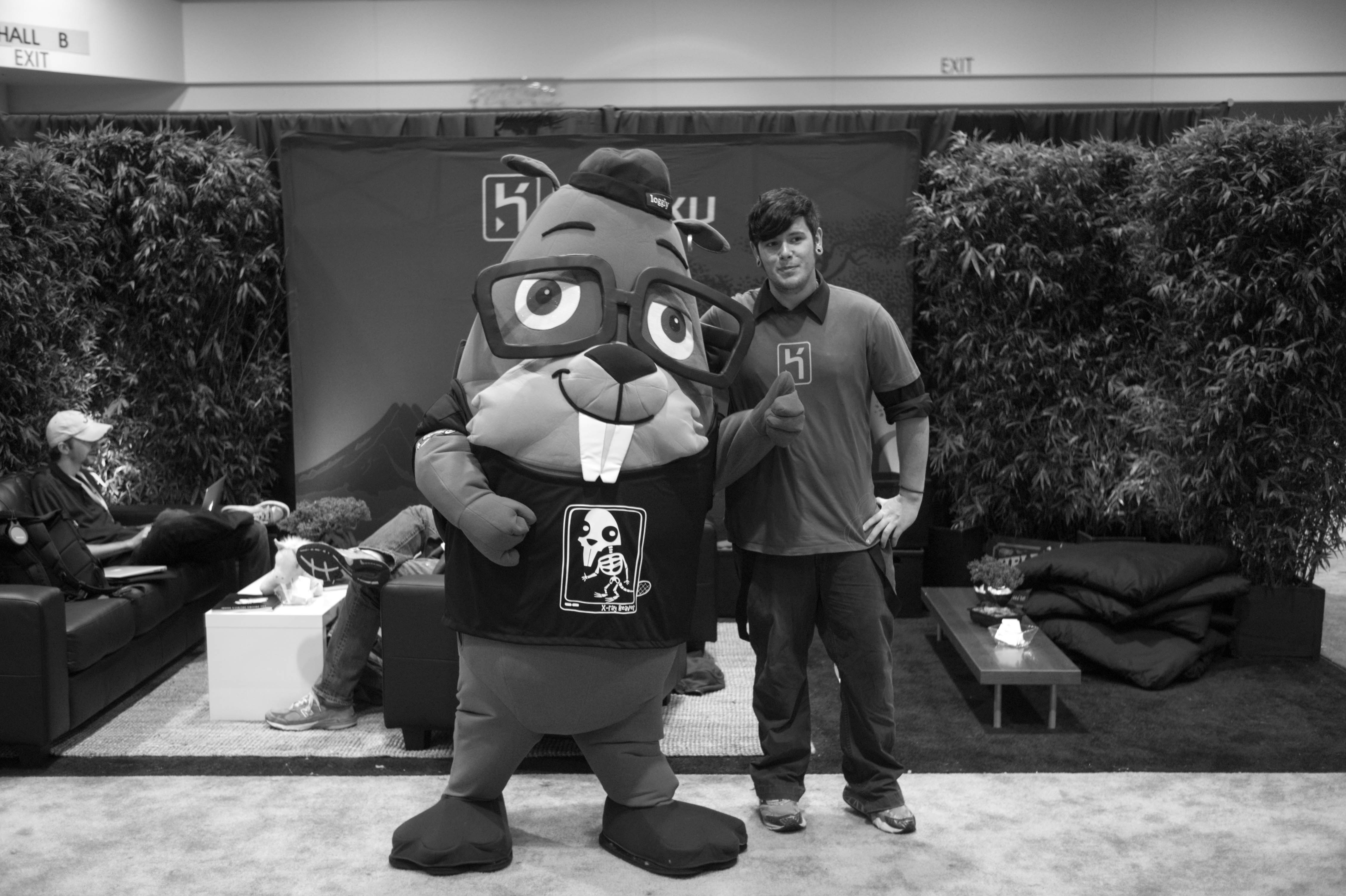 The photograph captures a whimsical moment at an event, featuring a lively mascot alongside a smiling individual. The black-and-white composition accentuates the playful expressions and camaraderie, set against a backdrop of soft furnishings and greenery that add a cozy atmosphere. The lighting is soft and even, enhancing the cheerful mood of the scene.