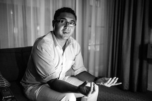 In a dimly lit hotel room, a man gestures expressively as he speaks, his face illuminated by a soft light that highlights his features against the dark surroundings. The contrast between light and shadow creates an intimate atmosphere, inviting a sense of engagement and candidness in the moment. His relaxed posture and open hands suggest a sincere and thoughtful conversation unfolding in this cozy setting.