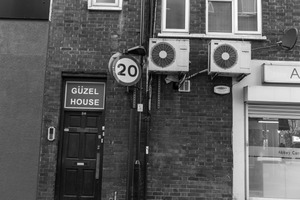This photograph captures a weathered brick wall adorned with the bold sign 'GÜZEL HOUSE,' immediately drawing attention to its name. The stark black-and-white contrast enhances the urban atmosphere, with air conditioning units haphazardly mounted above, suggesting a juxtaposition between comfort and the gritty environment. The mood is strikingly reflective, inviting viewers to ponder the stories behind this ordinary but telling streetscape.