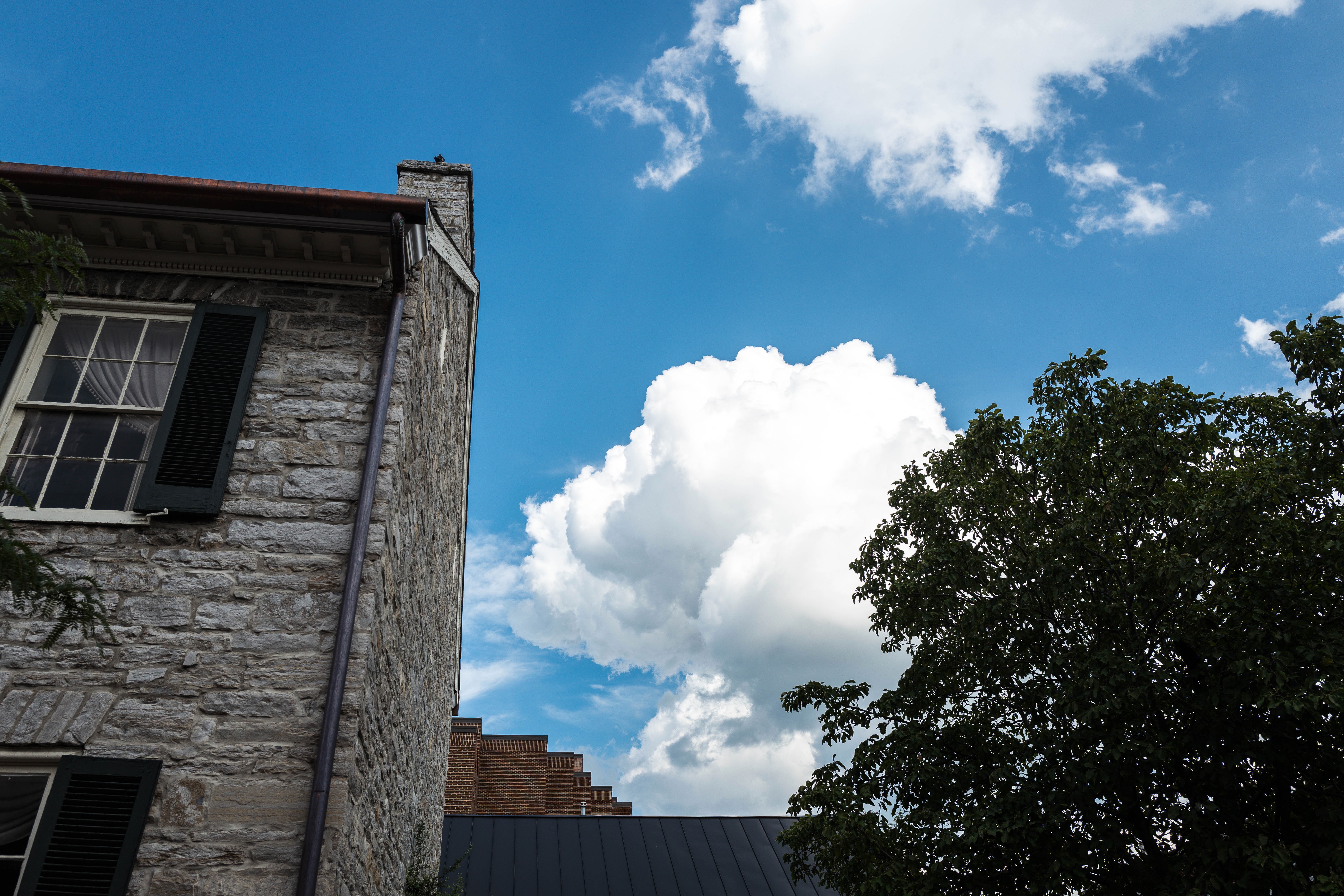 The photograph captures the charming corner of a stone house, with its rustic architecture juxtaposed against a vivid blue sky adorned with fluffy, white clouds. A vibrant tree frames the composition, enhancing the serene atmosphere and inviting a sense of tranquility. The interplay of light and shadow highlights the texture of the stone and adds depth to the scene, creating a peaceful moment in time.
