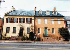 Two charming historic houses stand side by side, showcasing a blend of yellow stucco and warm brick textures. Soft, diffused light casts a gentle glow on the facades, while the surrounding greenery hints at a serene, inviting neighborhood. The contrast of architectural styles evokes a sense of history and character amidst modern life.