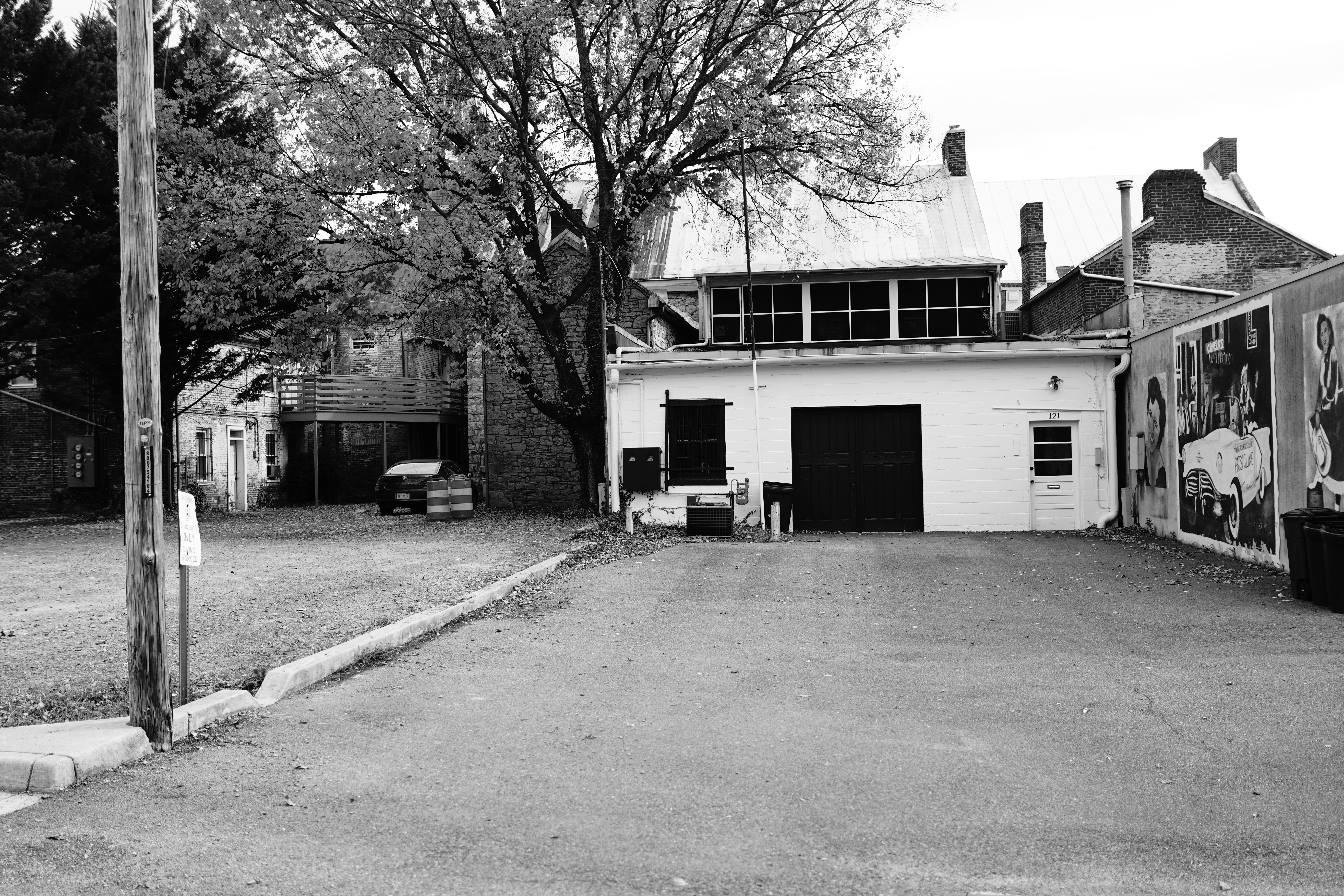 This black and white photograph captures a serene urban scene, featuring a modest structure tucked between sprawling trees and a mural-adorned wall. The composition draws the eye toward the dark garage door, creating a stark contrast against the softer textures of the surrounding foliage. A muted, overcast sky enhances the contemplative mood, inviting reflection on the juxtaposition of nature and man-made spaces.