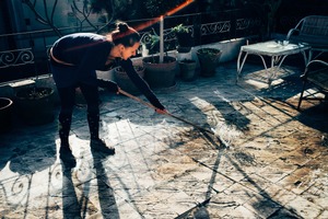 A woman kneels on a sunlit terrace, energetically sweeping water across the patterned stone floor. The vibrant play of light and shadows from surrounding plants creates a dynamic ambiance, enhancing the sense of tranquility in her daily routine. The warm sunlight bathes the scene, evoking a sense of peace and purpose in the simplicity of her task.