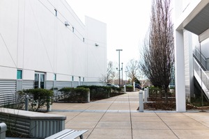 This photograph captures a quiet urban pathway framed by modern architectural elements and sparse landscaping. The soft, diffused lighting enhances the tranquil mood, while the clean lines of the building contrast with the organic shapes of the bare trees. The composition directs the viewer's gaze down the path, inviting exploration in a minimalist setting.