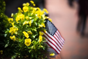 This photograph captures a vibrant cluster of yellow flowers adorned with a small American flag. The shallow depth of field draws the viewer's eye to the blossoms, evoking a sense of warmth and camaraderie amidst a bustling background. The soft lighting enhances the cheerful hues, creating a serene yet patriotic mood.