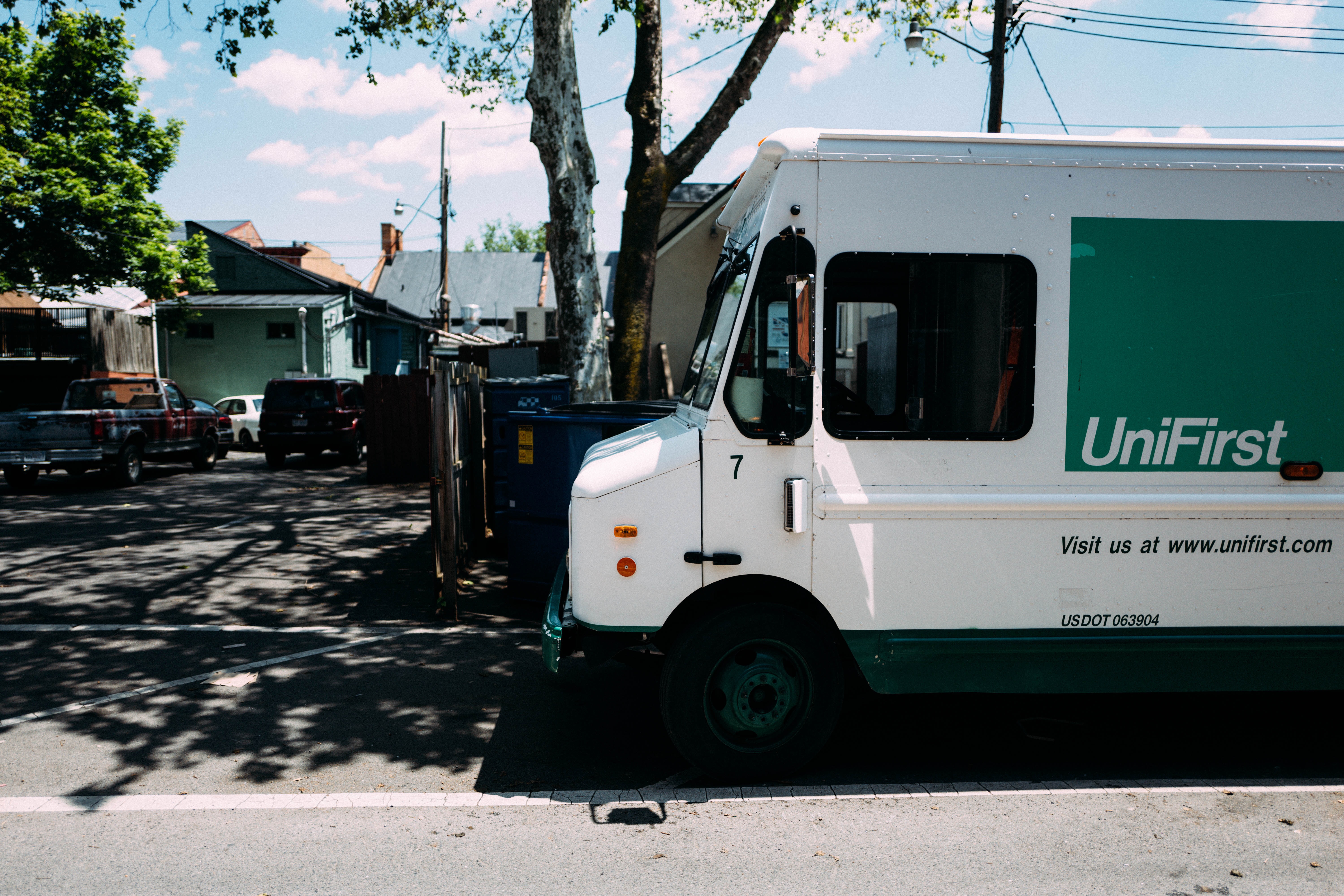 This photograph captures a delivery truck parked at the side of a quiet street, framed by tall trees and old buildings. Bright sunlight filters through the leaves, casting playful shadows on the pavement, while the vibrant turquoise and white colors of the truck offer a striking contrast against the urban backdrop. A sense of calm is evoked, reflecting the everyday rhythm of city life.