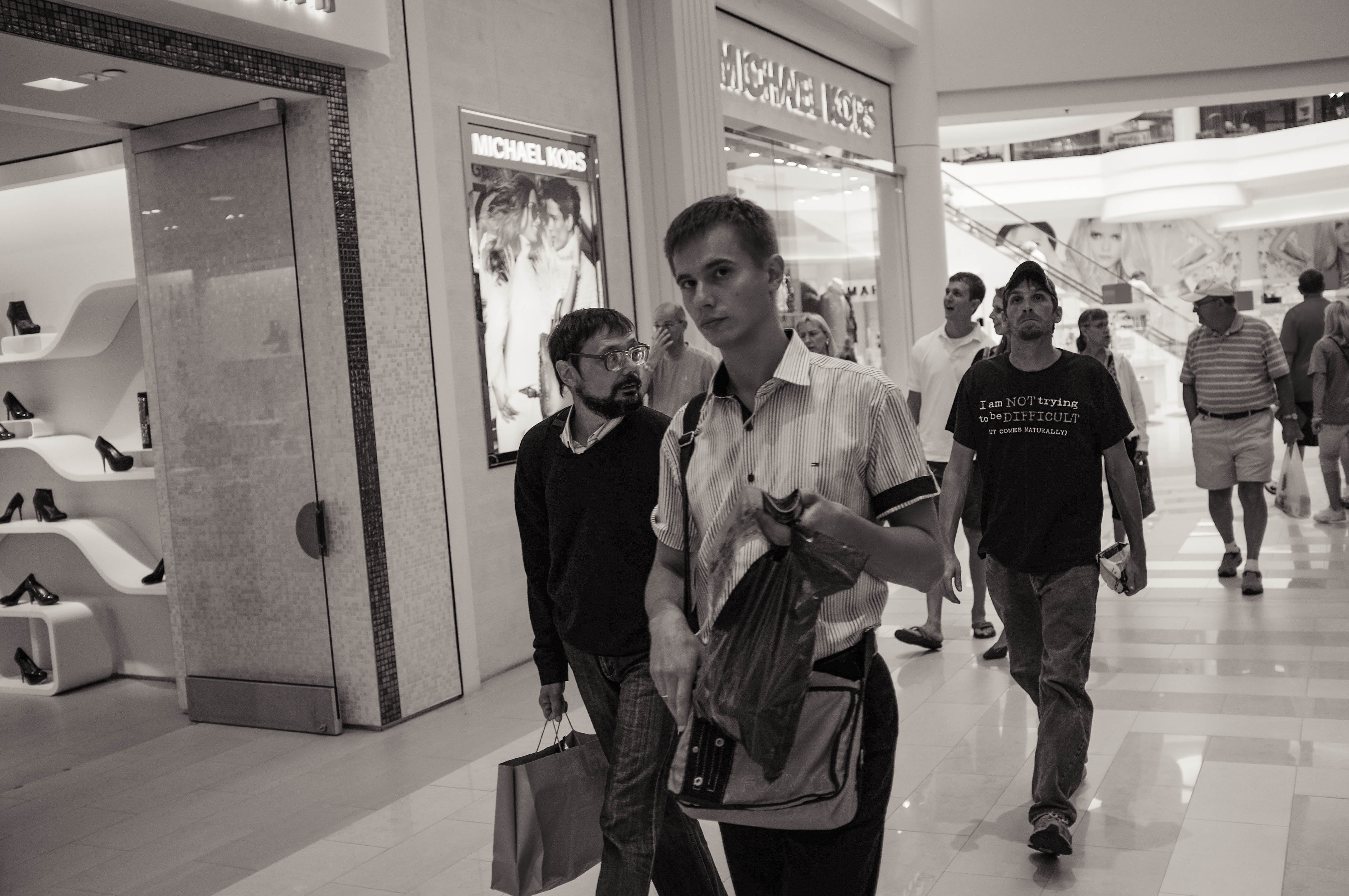 A bustling mall scene captured in monochrome, portraying a mix of shoppers amid bright displays. The sharp contrasts highlight the expressions of passersby, with one young man standing out in the foreground, holding a bag, while glancing at another man beside him. The overall mood is one of casual exploration, with a blend of curiosity and indifference in a modern retail environment.