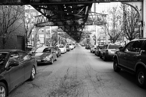 The photograph captures a stark, monochromatic view of a city street lined with parked cars beneath a looming elevated train track. The sense of isolation is heightened by the empty road and the bare trees, reflecting an industrial mood. Dappled light filters through the girders above, adding depth and creating a contrast between light and shadow.