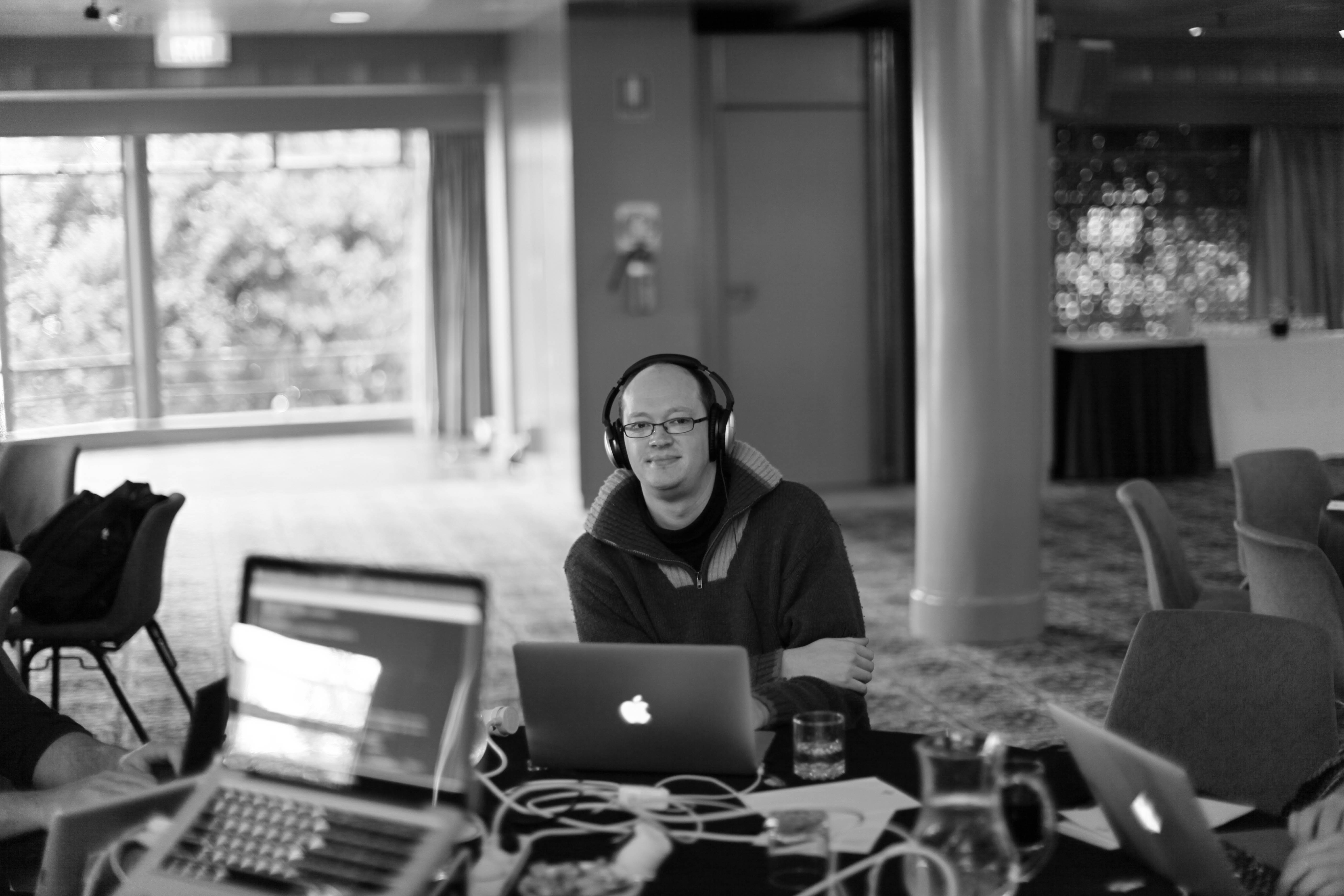 In a dimly lit room, a man wearing headphones sits at a table cluttered with tech equipment, exuding an air of concentration and creativity. The soft light streaming in from the window casts a gentle glow, contrasting with the stark black-and-white tones that highlight his calm demeanor amidst a busy workspace. The composition draws the eye to the subject, emphasizing his connection to the digital realm around him.