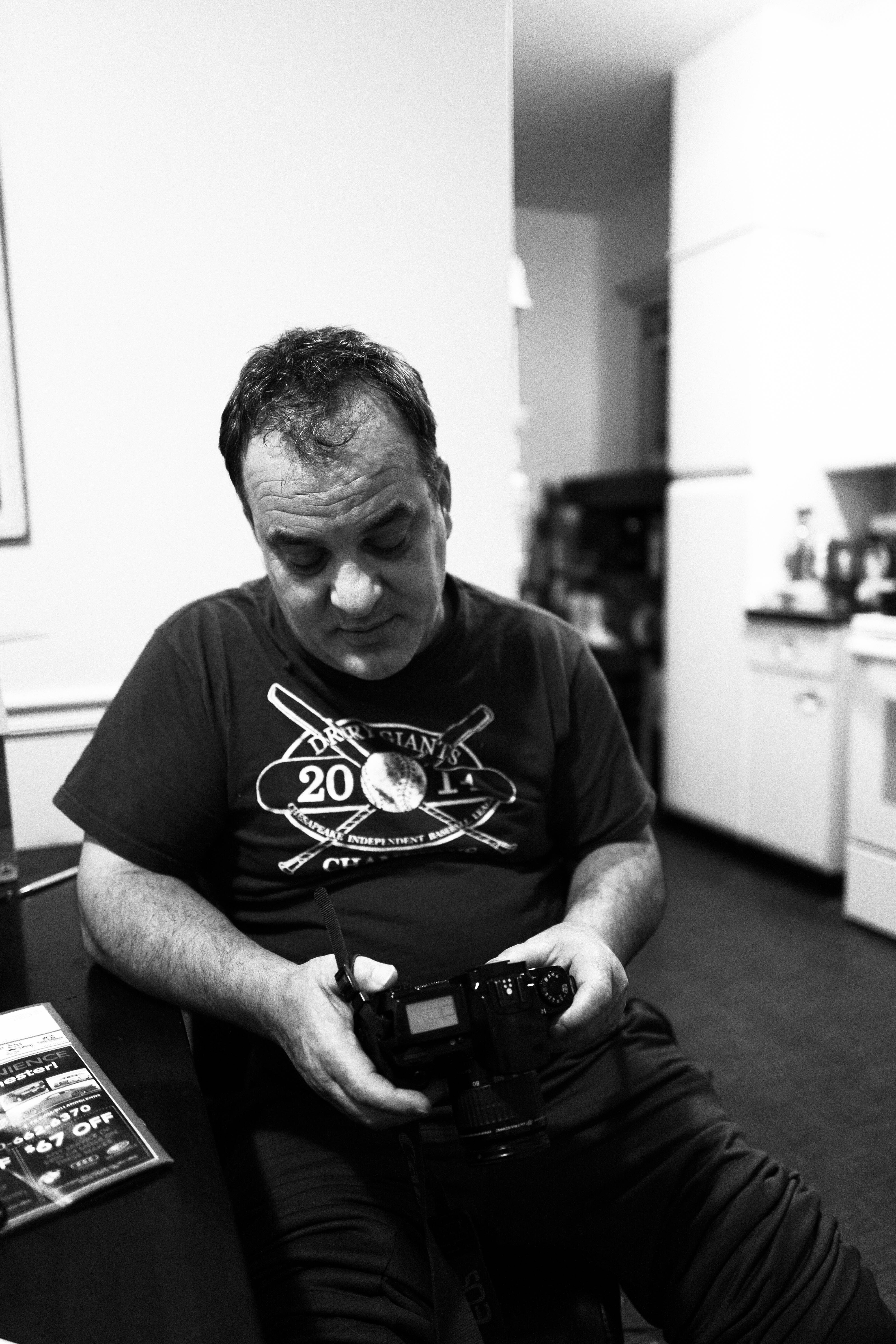 In a dimly lit kitchen, a man sits quietly, absorbed in his thoughts as he examines his camera. His relaxed posture and the soft shadows evoke a sense of introspection, highlighting the contrast between the bright kitchen and the darker areas surrounding him. The black and white tones enhance the mood, creating a timeless quality that invites deeper contemplation about the moments captured through his lens.