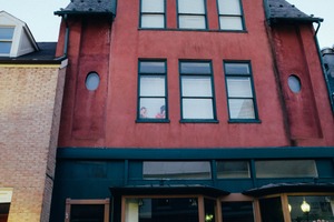 A vibrant, red-walled building captures attention as two figures occupy a window, their silhouettes suggesting a shared moment of intimacy. The warm, natural light casts a gentle glow, enveloping the scene in a serene and contemplative mood. The composition, with its clean lines and contrasting colors, evokes a sense of connection amidst urban solitude.
