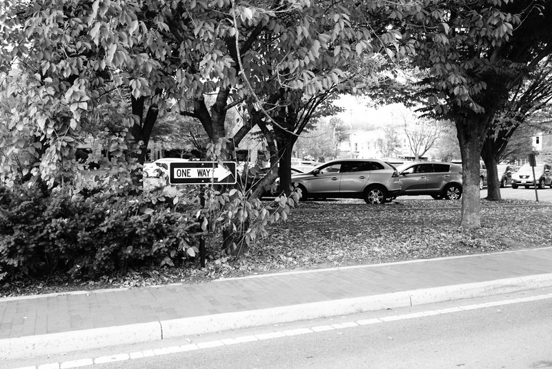 The photograph captures a 'One Way' street sign nestled among lush trees, casting dappled shadows and framing the scene. The muted black-and-white tones enhance a contemplative mood, evoking a sense of solitude and serenity. Subtle details of parked cars and fallen leaves suggest a stillness that invites the viewer to pause and reflect on the passage of time.