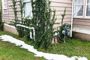 This photograph captures the intersection of nature and architecture, showcasing ivy intertwining with the corner of a house. The muted colors and soft lighting evoke a serene, almost melancholic mood, as the remnants of snow hint at a transitioning season. The composition draws the eye to the delicate balance of the green ivy against the textured wooden siding, emphasizing nature's persistent reclaiming of space.