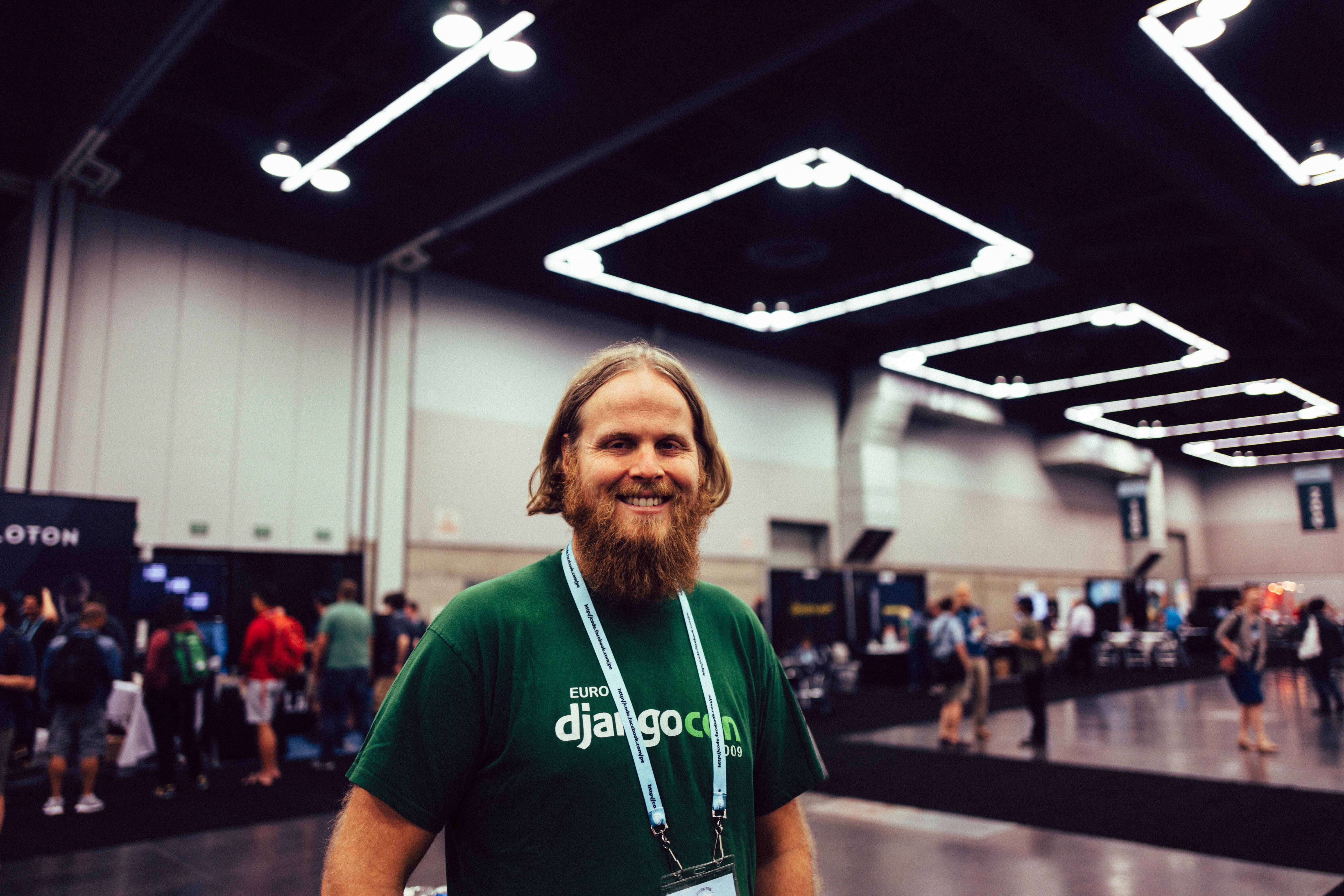 In this vibrant conference setting, a smiling attendee clad in a green DjangoCon t-shirt stands confidently amidst a bustling background. The soft, ambient lighting highlights his joyful expression, while the geometric fixtures above add a modern touch to the overall atmosphere of enthusiasm and connection.