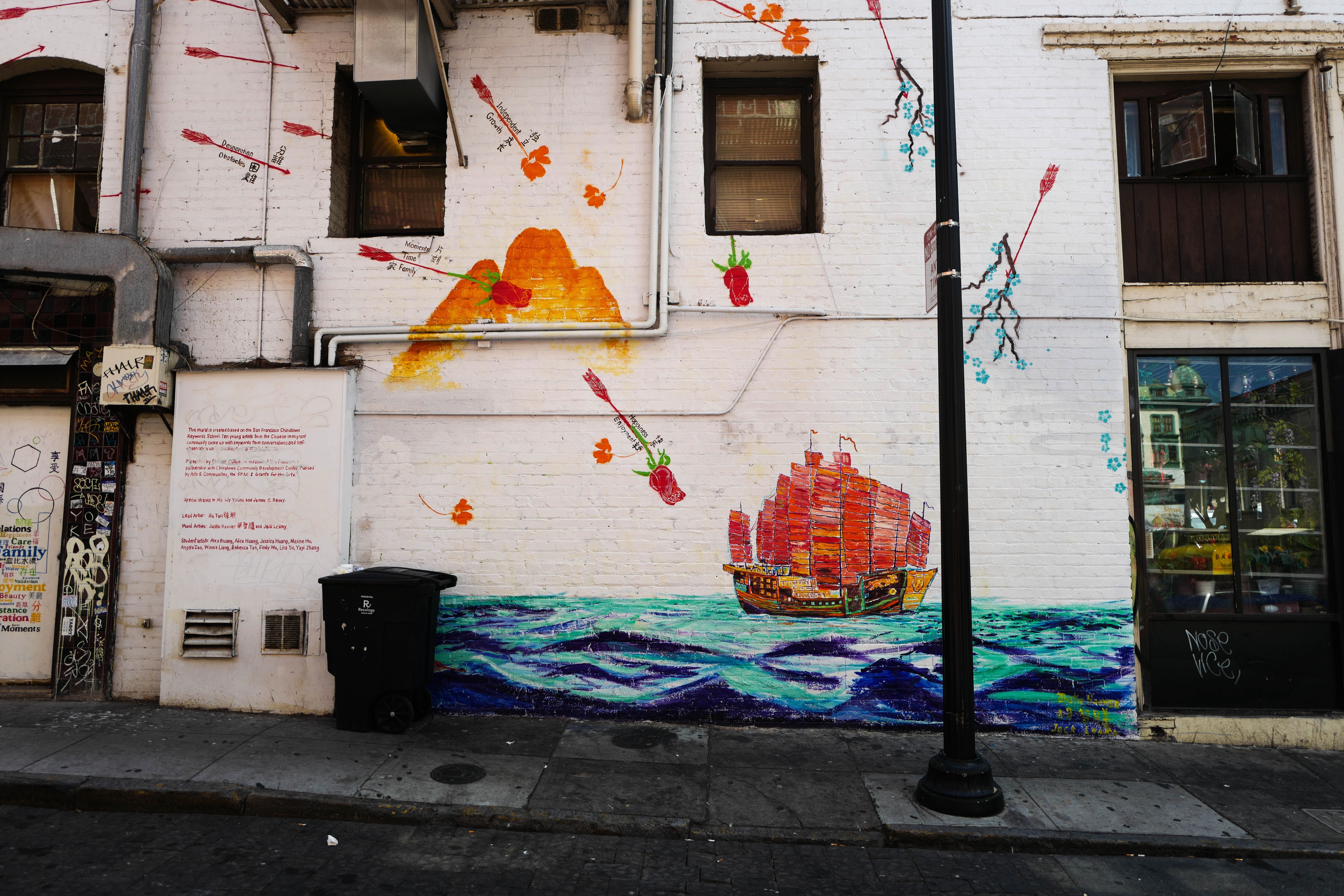 The photograph captures a vibrant mural on a brick wall, showcasing a colorful ship sailing through stylized waves. The whimsical arrangement of arrows, flowers, and abstract shapes creates a playful atmosphere, contrasting with the urban setting. Bright lighting enhances the vivid colors, giving the scene a lively and inspiring mood.