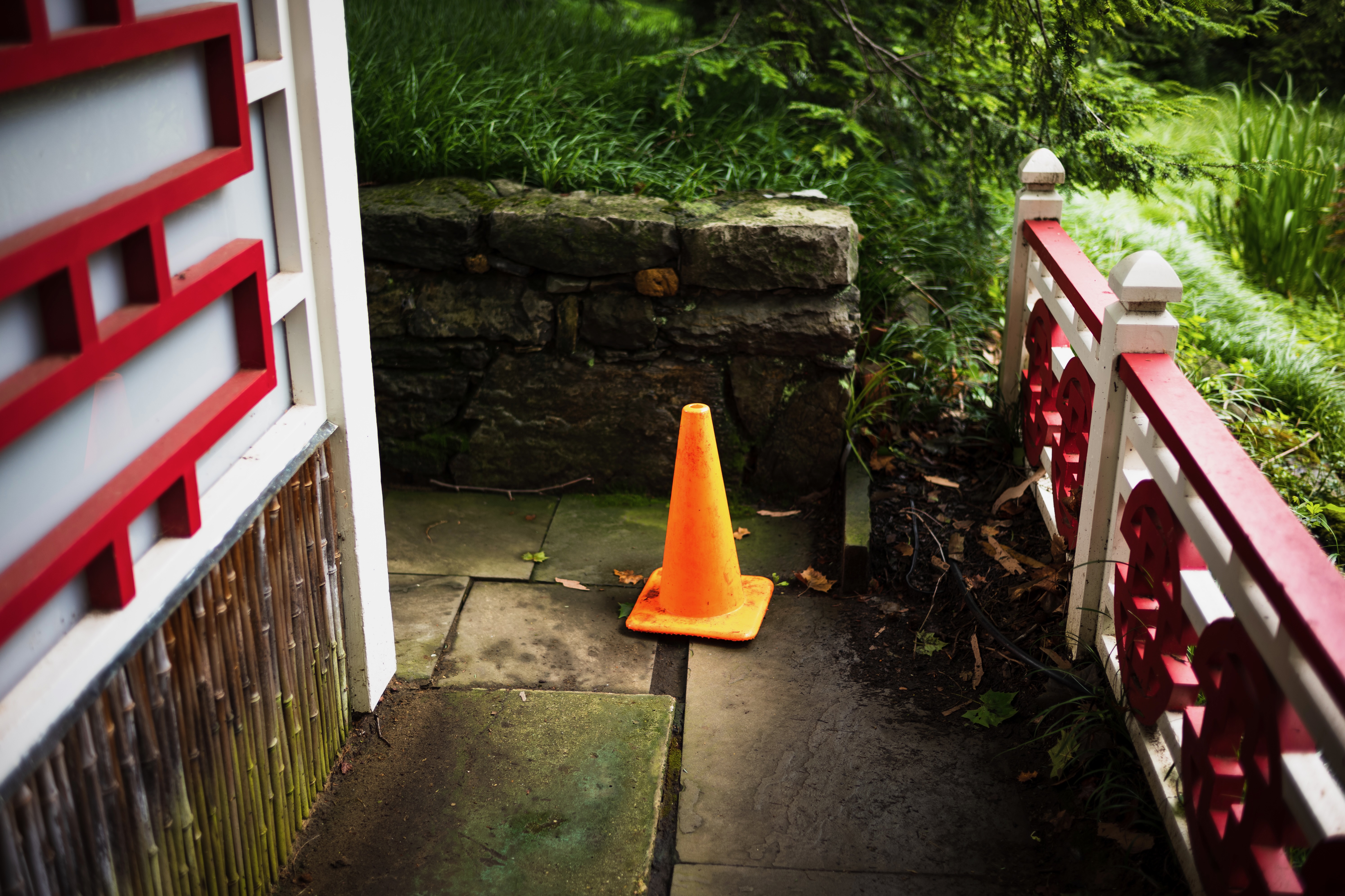 This photograph juxtaposes an orange traffic cone with tranquil surroundings, highlighting an unexpected element in a serene garden setting. The vibrant cone contrasts sharply with the cool greens and natural textures, creating a striking visual tension. Soft, diffused light enhances the mood, lending an air of contemplation to the composition as nature subtly encroaches on human structures.
