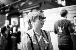 In a bustling environment, a young woman with distinctive glasses and a playful hairstyle stands out, captured in a moment of thought. The composition showcases her against a softly blurred background of people, enhancing her contemplative expression. The monochrome tones lend an air of nostalgia, while the subtle lighting highlights her features and draws focus to her nuanced demeanor amidst the activity around her.